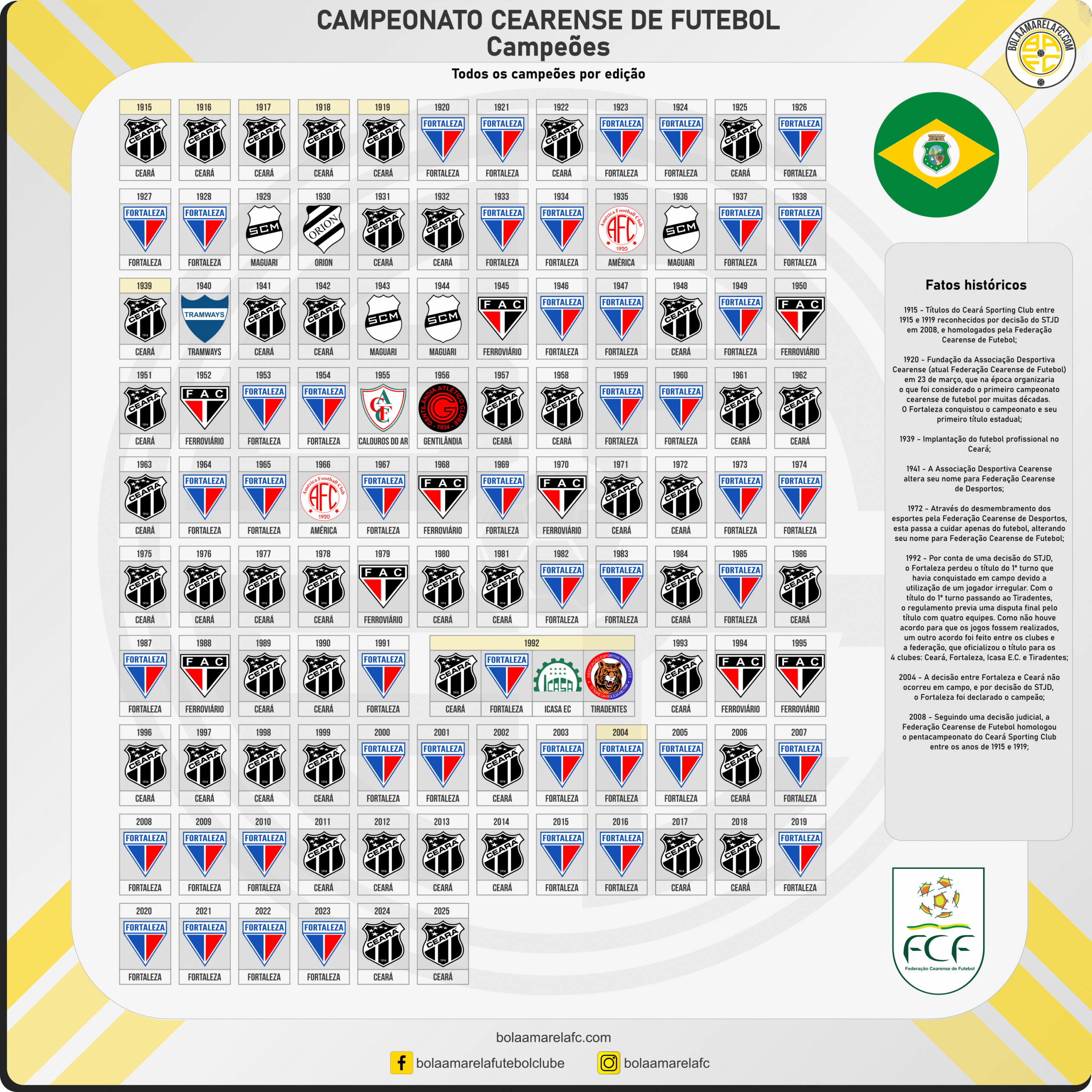 FCF HOMOLOGA PENTA DO CEARÁ DE 1915 A 1919. Disponível em: <https://diariodonordeste.verdesmares.com.br/jogada/fcf-homologa-penta-do-ceara-de-1915-a-1919-1.545043>. Acesso em: 07 jun 2020.